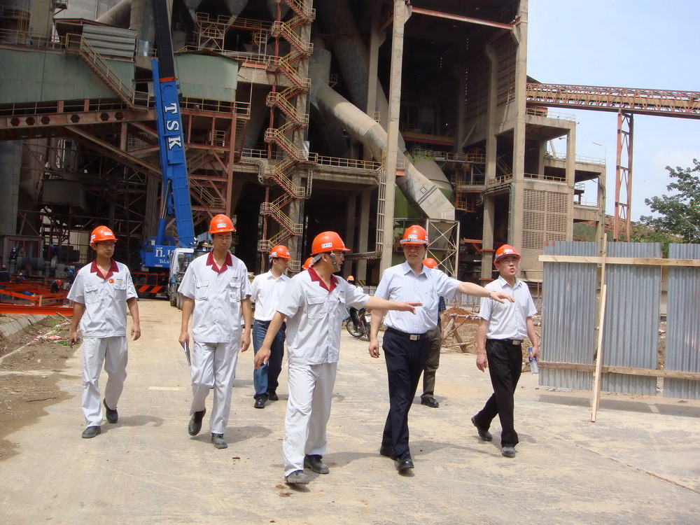 6月,何新平總經理、魏文華副總經理、董蘭起副總工程師等一行七人,也趕到京都項目現場檢查、指導工作。到現場后顧不上休息,換上安全鞋,戴上安全帽,風塵仆仆視察了循環水冷卻塔、化學水處理室、汽輪發電機廠房、SP5鍋爐、AQC5鍋爐、AQC6鍋爐、SP6鍋爐等施工工地。何總對每個項目都仔細觀察,了解各個環節的關鍵點及存在問題,在SP5鍋爐看到所在位置錯綜復雜,水泥線的輸送從框架中間穿過,并且被水泥線的窯尾、生料磨房、生料輸送三面包圍,又由于和汽輪發電機廠房相距較近,根本沒有鍋爐鋼架制作場地。就明確指出SP5是京都項目工程中的關鍵點,加快土建施工速度是首要問題,決不能因為土建而貽誤工期。何總在現場與魏總、董總、王品副部長及京都項目吳蘇軍經理商量后,當場拍板:為了加快施工進度,將鋼筋混凝土框架改為鋼筋混凝土框架柱,平臺改為鋼結構形式。對其它各點也進行了精辟地一一闡述……