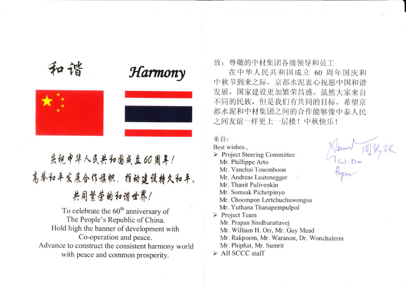 10月1日,適逢中華人民共和國(guó)成立60周年和中秋佳節(jié)即將到來(lái)之時(shí),京都水泥廠(chǎng)的Choompon Lertchuchuwongsa先生和Prapan Sindhurattavej先生代表京都水泥廠(chǎng)的領(lǐng)導(dǎo)團(tuán)隊(duì)和全體員工前往中材節(jié)能京都項(xiàng)目部,共同慶祝中華人民共和國(guó)成立60周年,向項(xiàng)目部全體人員致以節(jié)日的祝賀,送上了月餅、水果等節(jié)日禮品,并轉(zhuǎn)達(dá)了京都水泥對(duì)中材集團(tuán)和中材節(jié)能全體領(lǐng)導(dǎo)和員工的誠(chéng)摯祝福。