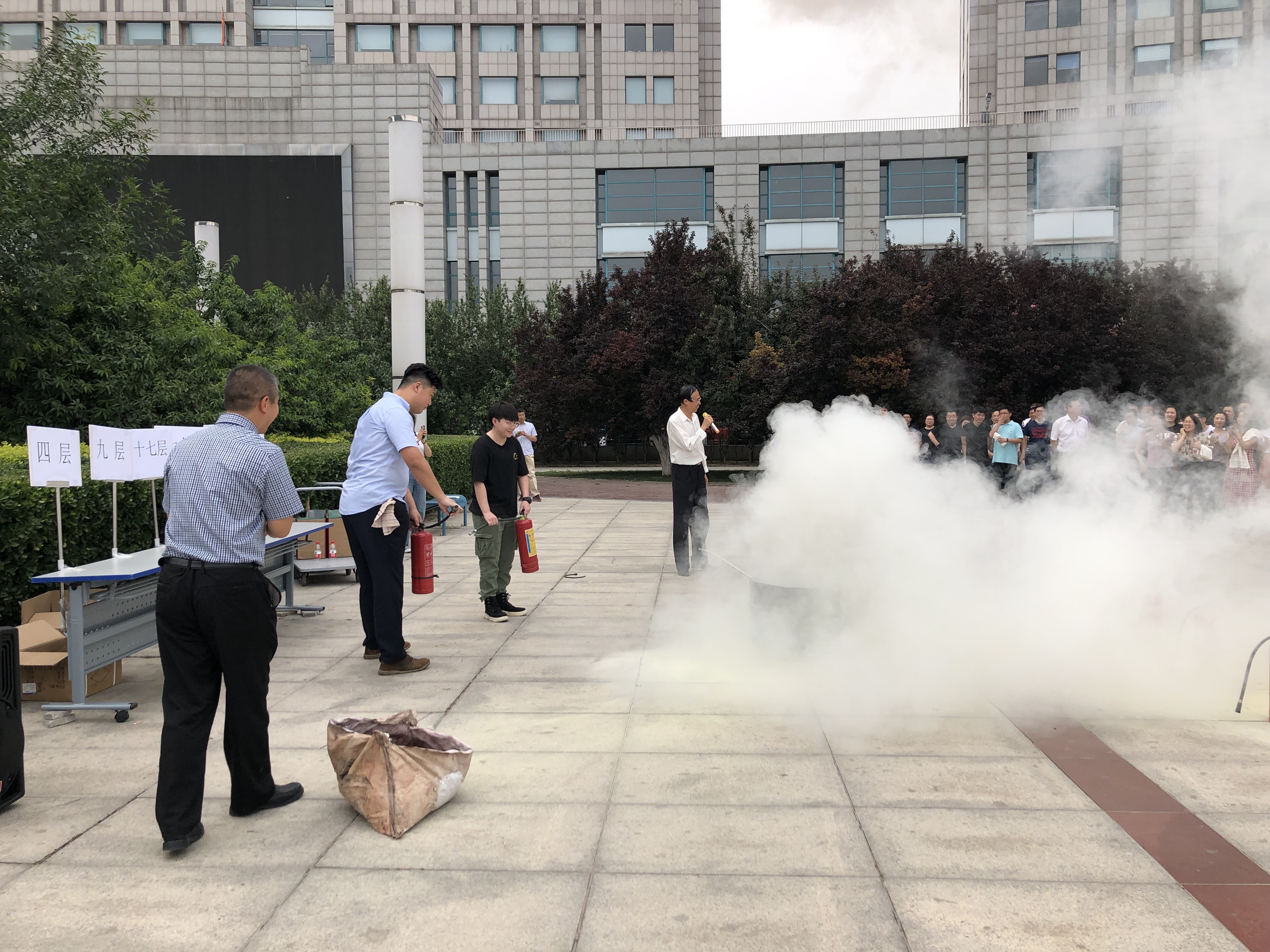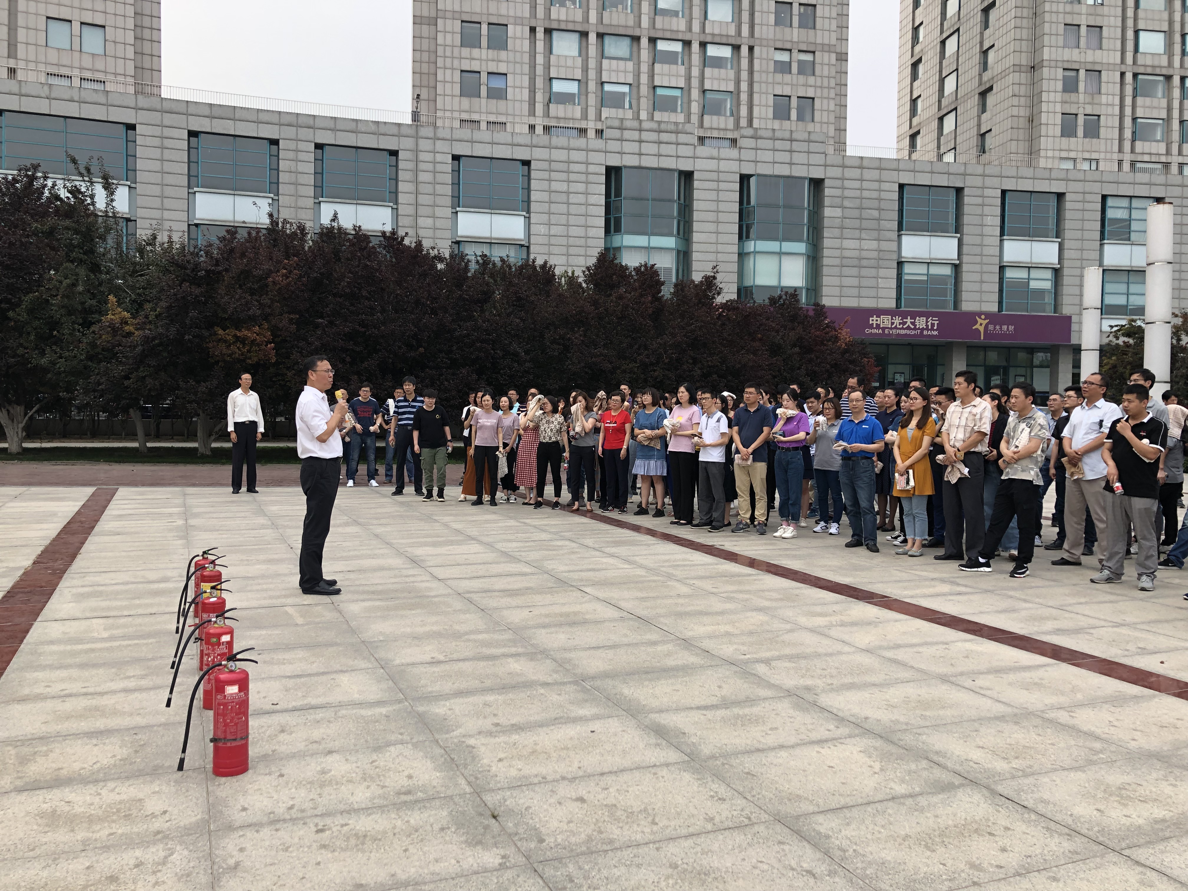 講座結束后,公司開展了辦公樓疏散演練。演練從15:28分警報響起到員工從辦公樓疏散到緊急集合點簽到完畢,歷時10分28秒,共191人撤離,整個撤離演練過程緊張有序,取得了預期效果。疏散演練后,公司總裁胡也明對此次消防疏散演練進行了總結。他特別強調安全是每個人的責任以及應急演練的重要性,并挑選了檔案室、機房、財務等相關部門人員進行了滅火器實操演練。