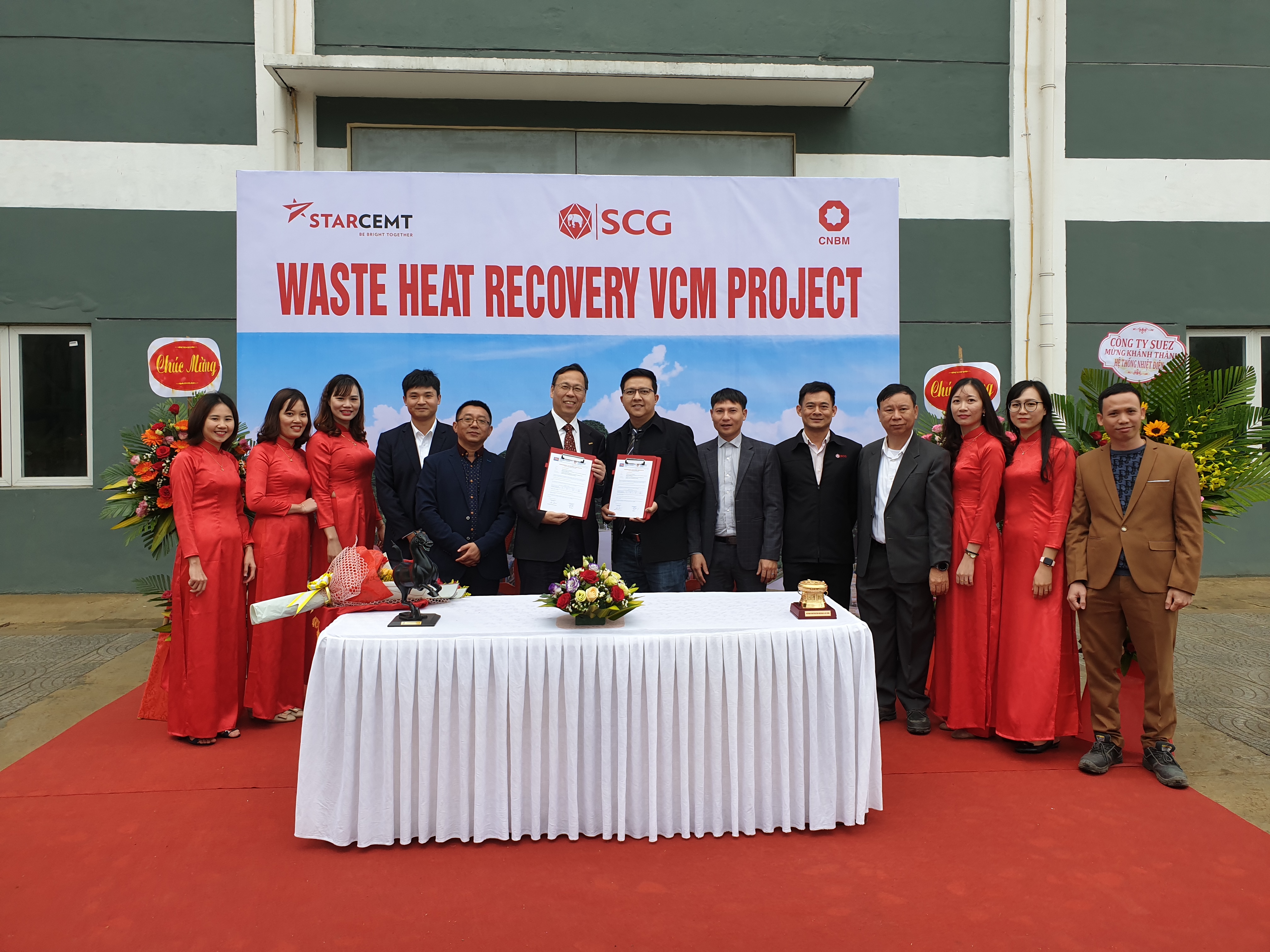 During the ceremony, Mr. Hu and Mr. Noppasak Jitsakulchaidej signed and exchanged PAC certificates and jointly cut the ribbon for the projects. After the ceremony, Mr. Hu, accompanied by Mr. Noppasak Jitsakulchaidej, Mr. Chamun Chaliewkreangkrai, GM of VCM, Mr. Varongsit Marrat, GM of SG, and Mr. Jiang Xiangdong, project manager of Sinoma EC, respectively visited the VCM and SG WHR plants.
